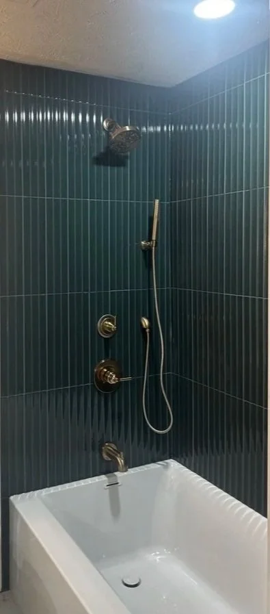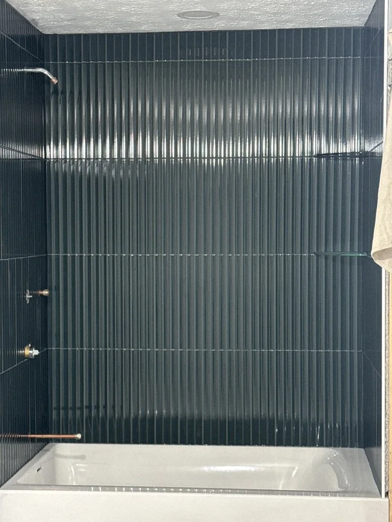 The design for this space, started with the vanity colors and the wall tile in the bathroom. The overall design is centered on a moody feel with wall trim, wallpaper, and unique floor tile.